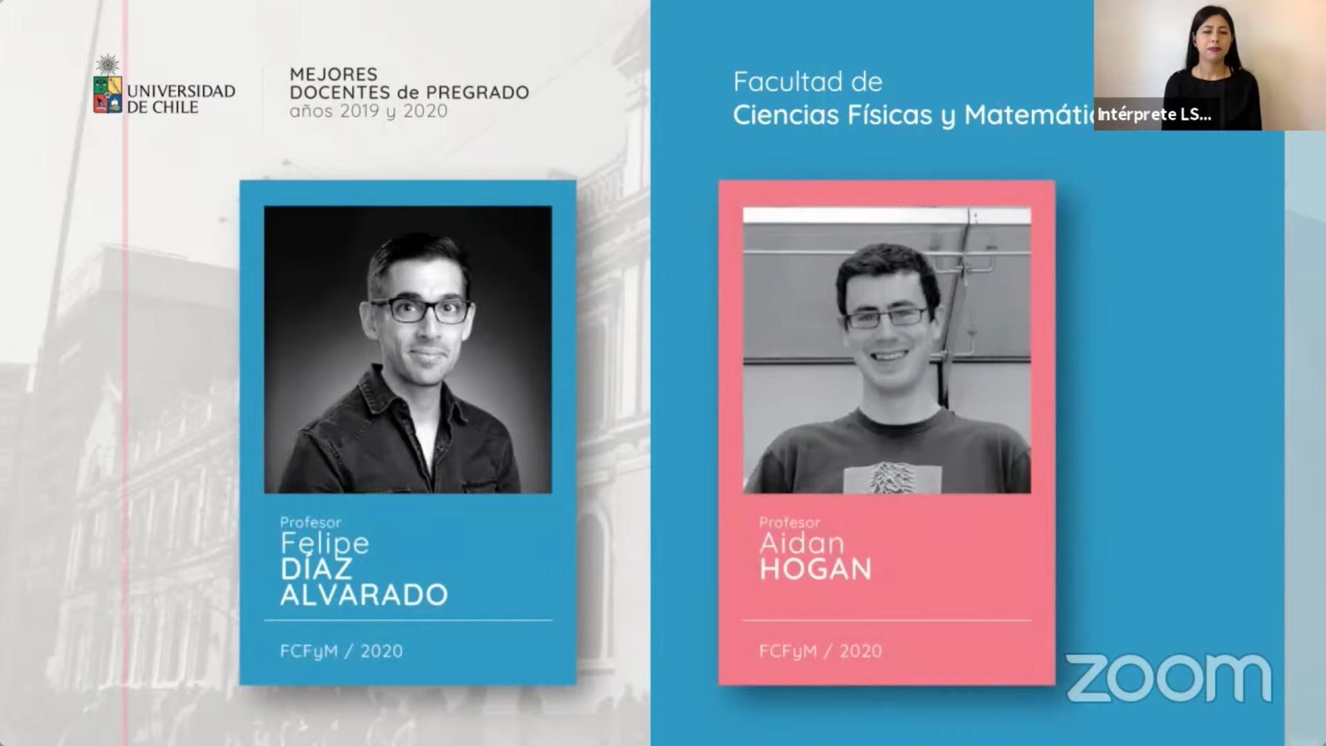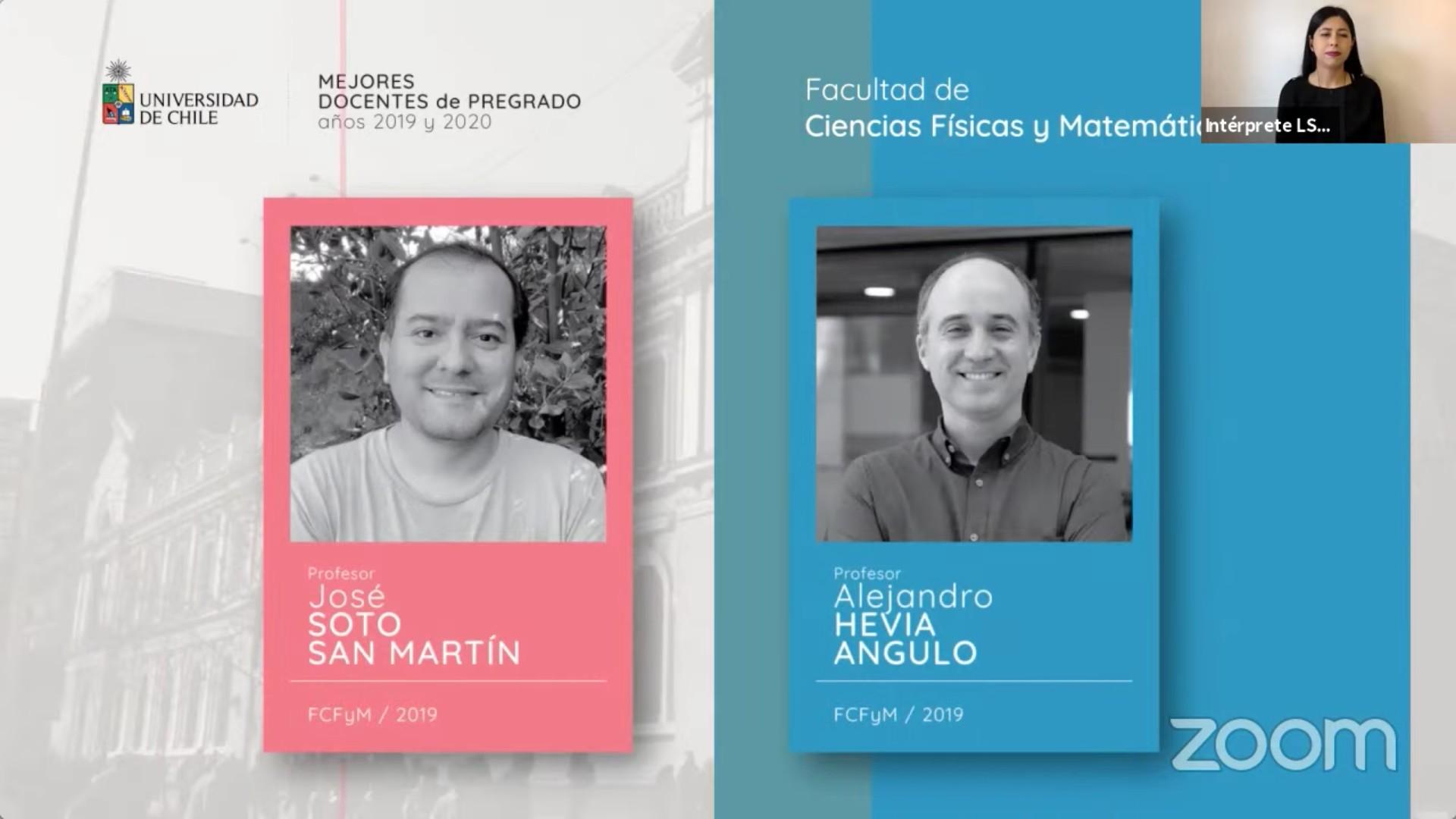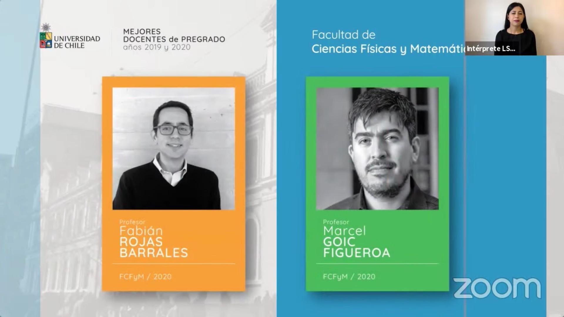 Nueve de los 77 docentes de pregrado galardonados pertenecen a la Facultad de Ciencias Físicas y Matemáticas, quienes son seleccionados de acuerdo a las evaluaciones que los propios estudiantes realizan. Alejandro Hevia (DCC), Bárbara Andrews (DIQBM), José Soto (DIM) y Sandra Céspedes (DIE) fueron los mejor evaluados en 2019, mientras que Aidan Hogan (DCC), Fabián Rojas (DIC), Felipe Díaz (DIQBM) y Marcel Goic (DII), en 2020. Luis Foa (DFI), en tanto, fue distinguido en ambos años.
