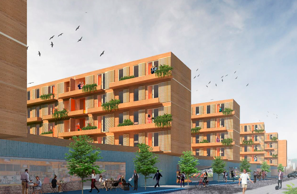 Render propuesta de vivienda en altura con madera masiva de pino radiata nacional