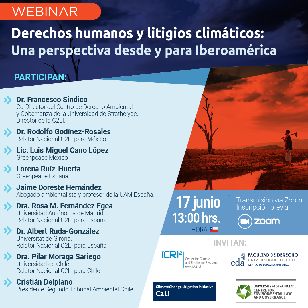 El Centro de Derecho Ambiental de la Universidad de Chile (CDA), el Centro de Ciencia del Clima y la Resiliencia (CR)2, Climate Change Litigation Initiative (C2LI) y el Centro de Derecho Ambiental y Gobernanza de la Universidad de Strathclyde (SCELG), invitan a la comunidad a participar en el Webinar «Derechos Humanos y Litigios Climáticos: Una Perspectiva desde y para Iberoamérica».