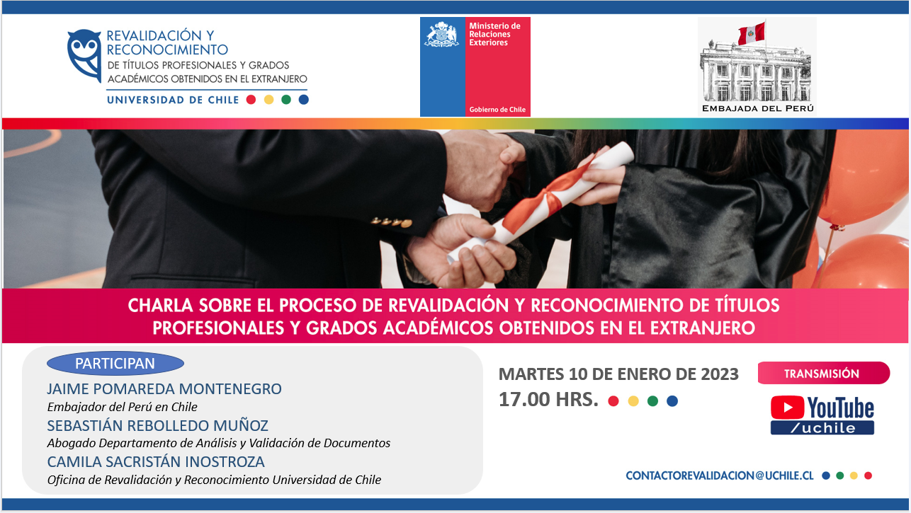 Los/as invitamos a una Charla virtual, organizada en conjunto con la Embaja de Perú y el Ministerio de Relaciones Exteriores de Chile (Minrel), con la finalidad que las personas tituladas en el extranjero puedan conocer tanto el proceso de Revalidación y Reconocimiento de Títulos y Grados Extranjeros en la Universidad de Chile, como el proceso de Reconocimiento mediante el convenio con Perú (Convención de México).