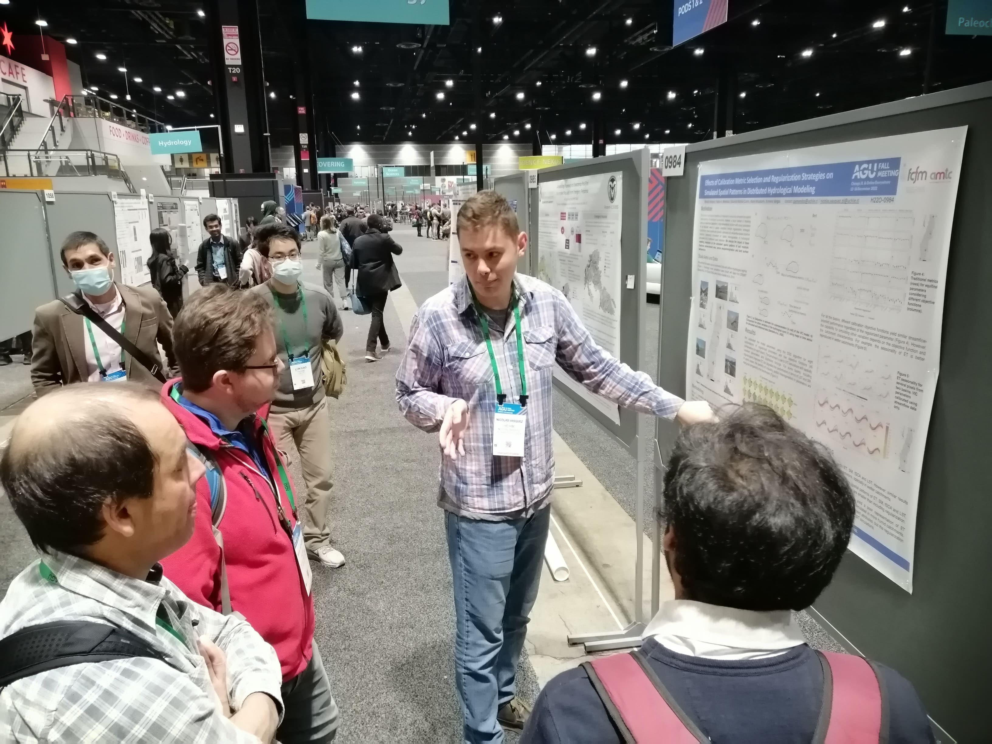 Durante la sesión de posters, Nicolás Cortés, estudiante de Magíster en Ciencias de la Ingeniería, mención Recursos y Medio Ambiente Hídrico, presentó su trabajo “To what extent does river routing matter in hydrological modeling?”; mientras que Nicolás Vásquez, estudiante de doctorado en Ingeniería Civil, presentó la investigación “Effects of Calibration Metric Selection and Regularization Strategies on Simulated Spatial Patterns”