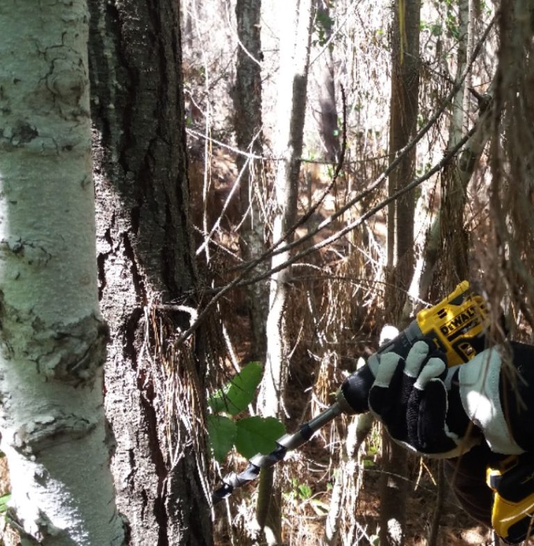 El proyecto titulado “Técnicas innovadoras de control de Pinus radiata en bosques de Nothofagus de la Región del Maule: buscando soluciones económico-ambientales factibles” (Proyecto CONAF 018/2018), arrojó como resultado que perforaciones al árbol de aproximadamente siete centímetros de longitud y 2 cm de diámetro, con la aplicación de una dosis mínima en términos de cantidad y concentración de un herbicida de la familia de las sulfonilureas, permite la muerte del pino en unos pocos meses, sin generar un impacto ambiental que afecte el crecimiento y desarrollo de las especies nativas de la zona y las funciones ecológicas de los ecosistemas estudiados.