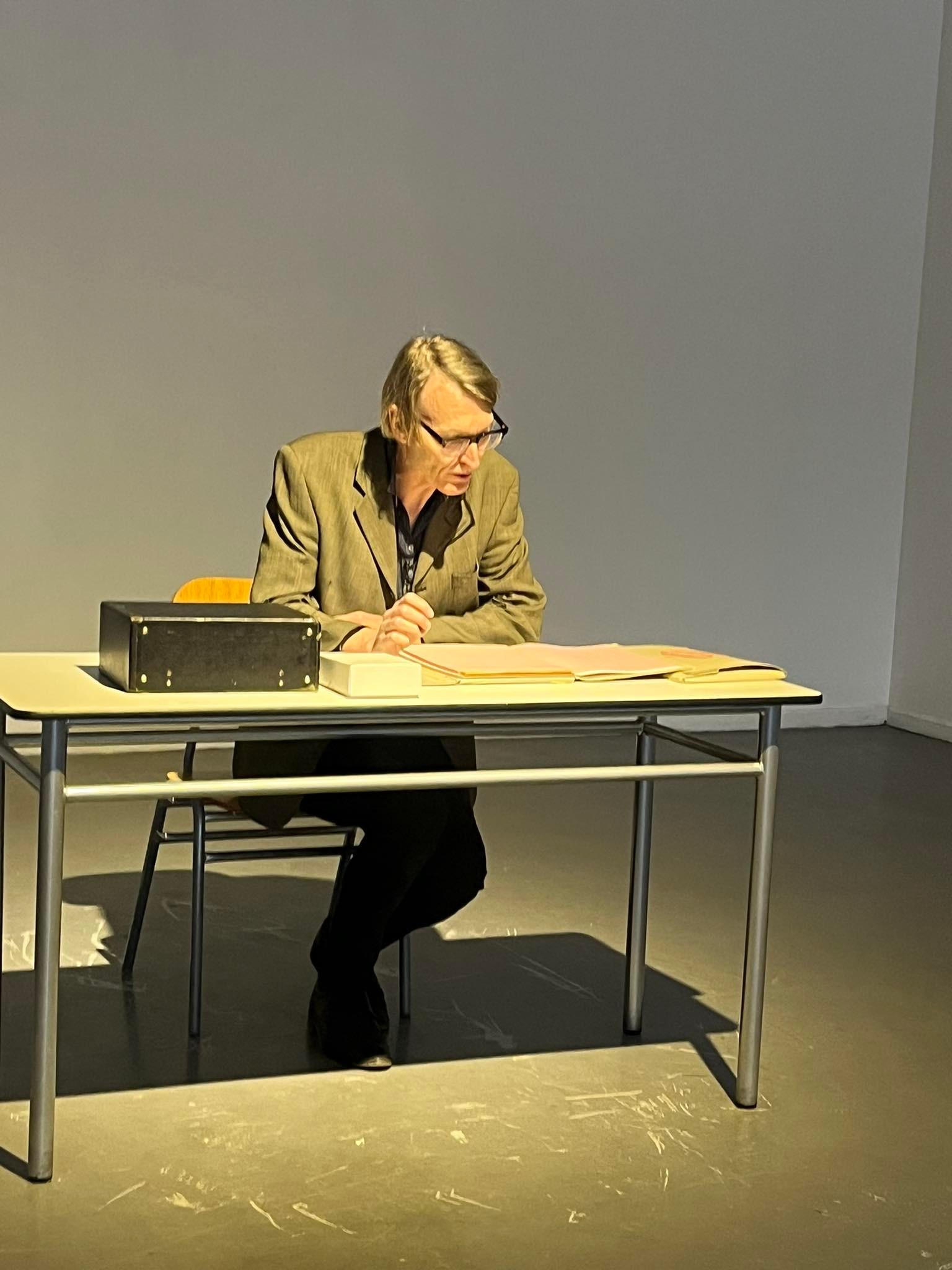 Así durante su puesta en escena, por cuarenta minutos aproximadamente, se dedicó a leer citas en diferentes soportes y con largas pausas: “Tronar los cerros, arar la tierra”, se le escuchó leer. “Ciudad de México, Valparaíso, Universidad de Chile, Las Encinas”, entre otros, fueron lugares que nombró Manfred durante su performance en la que recorre 2800 años de texto, de inscripción de los cuerpos y la tierra.