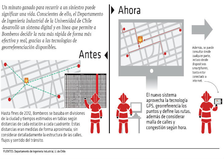 Ser capaz de llegar rápidamente con ayuda en situaciones de emergencia puede significar la diferencia entre la vida y la muerte. Todos los días, los cuerpos de bomberos en el país se ven enfrentados a este problema cuando responden a emergencias. El Departamento de Ingeniería Industrial de la FCFM de la Universidad de Chile, en colaboración con el Cuerpo de Bomberos de Santiago (CBS), ha desarrollado una nueva forma de despachar vehículos de emergencias que toma en consideración el mapa de calles de Santiago, la congestión y la reversibilidad de las vías de acceso. Este desarrollo, que el CBS utiliza desde noviembre de 2012, motivó una parte del proyecto Fondef "Tecnologías avanzadas para las ciudades del futuro" que considera la incertidumbre presente en los tiempos de viaje y en las emergencias para desarrollar sistemas de despacho y localización que, además, puedan incluir criterios de riesgo.