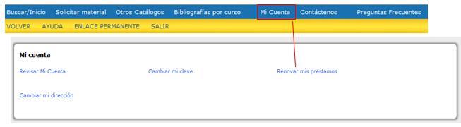 Desde el Catálogo Bello: www.catalogo.uchile.cl, a través de la opción Mi Cuenta, es posible hacer renovación de material solicitado. 1. Seleccionar opción Renovar mis préstamos |